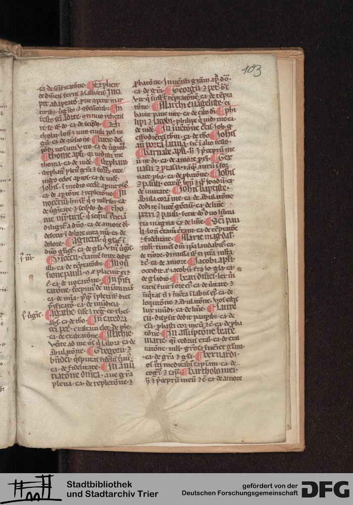 - TextGrid Repository (2017). Stadtbibliothek und Stadtarchiv Trier, Hs. 226/1386 8°: Sammelhandschrift. Inhalte. Stadtbibliothek und Stadtarchiv Trier Hs. 226/1386 8°. Zuordnung dieser Predigten zu den Festen und Tagen des Temporale. Blatt 103r. Blatt 103r. Virtuelles Skriptorium St. Matthias. Stadtbibliothek und Stadtarchiv Trier. https://hdl.handle.net/11378/0000-0008-3494-6