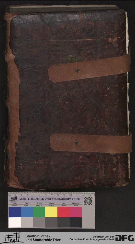 - TextGrid Repository (2017). Stadtbibliothek und Stadtarchiv Trier, 814/1340 4°: Sammelhandschrift. Inhalte. Stadtbibliothek und Stadtarchiv Trier Hs. 814/1340 4°. Vorderdeckel mit Fragment. Vorderdeckel. Vorderdeckel. Virtuelles Skriptorium St. Matthias. Stadtbibliothek und Stadtarchiv Trier. https://hdl.handle.net/11378/0000-000A-01C3-8