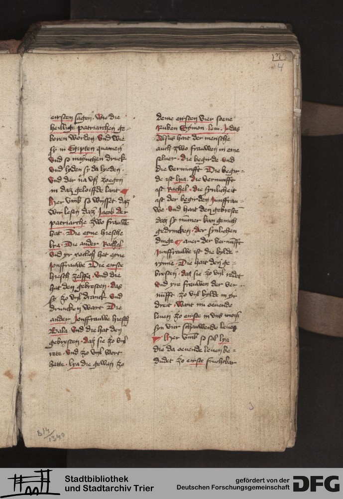 - TextGrid Repository (2017). Stadtbibliothek und Stadtarchiv Trier, 814/1340 4°: Sammelhandschrift. Inhalte. Stadtbibliothek und Stadtarchiv Trier Hs. 814/1340 4°. Dialog über die Kardinaltugenden. Blatt 3r. Blatt 3r. Virtuelles Skriptorium St. Matthias. Stadtbibliothek und Stadtarchiv Trier. https://hdl.handle.net/11378/0000-000A-01D7-2