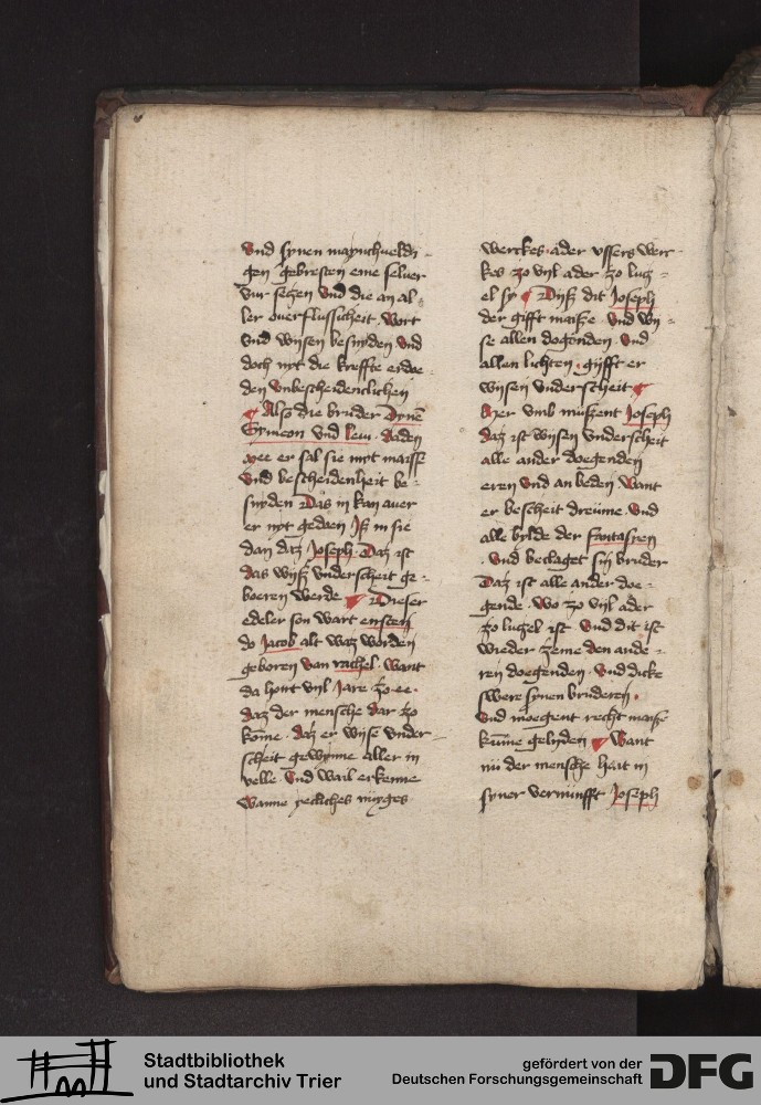 - TextGrid Repository (2017). Stadtbibliothek und Stadtarchiv Trier, 814/1340 4°: Sammelhandschrift. Inhalte. Stadtbibliothek und Stadtarchiv Trier Hs. 814/1340 4°. Dialog über die Kardinaltugenden. Blatt 5v. Blatt 5v. Virtuelles Skriptorium St. Matthias. Stadtbibliothek und Stadtarchiv Trier. https://hdl.handle.net/11378/0000-000A-01E1-6