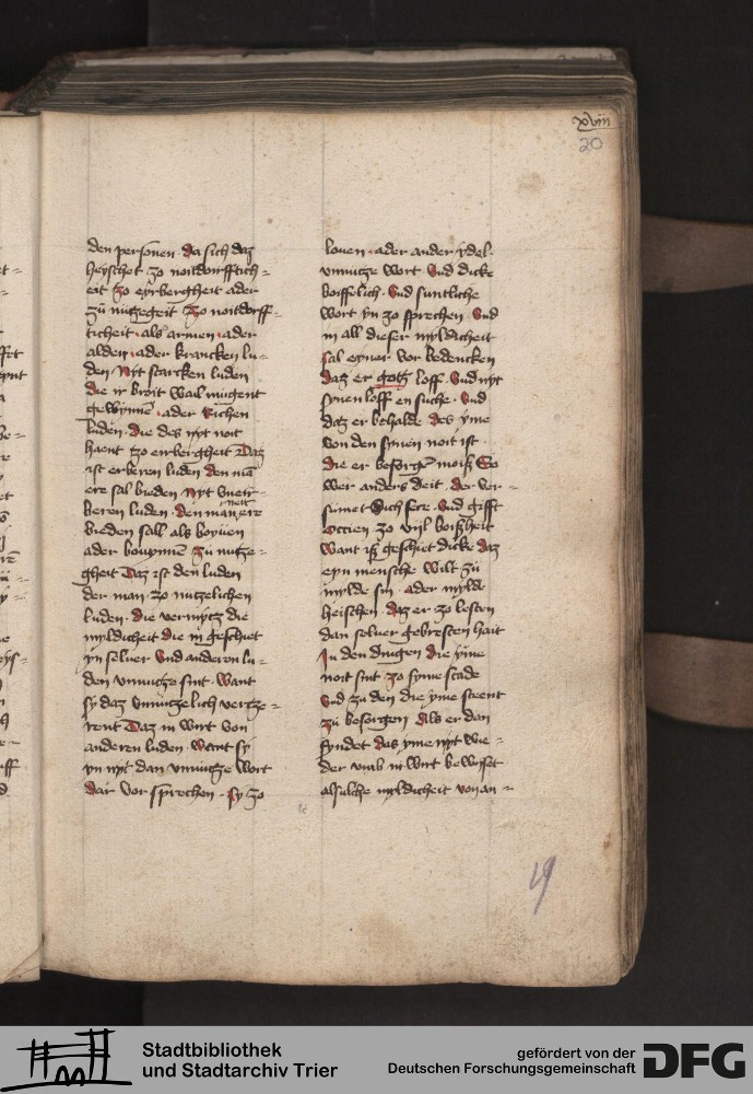 TextGrid Repository (2017). Stadtbibliothek und Stadtarchiv Trier, 814/1340 4°: Sammelhandschrift. Inhalte. Stadtbibliothek und Stadtarchiv Trier Hs. 814/1340 4°. Dialog über die Kardinaltugenden. Blatt 19r. Blatt 19r. Virtuelles Skriptorium St. Matthias. Stadtbibliothek und Stadtarchiv Trier. https://hdl.handle.net/11378/0000-000A-0217-A