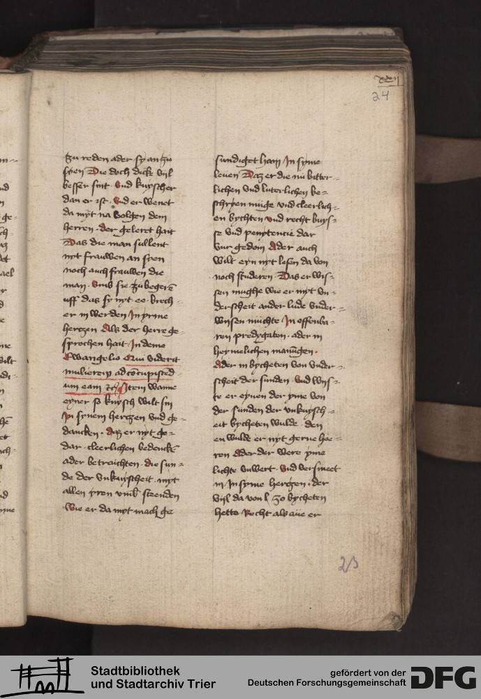 - TextGrid Repository (2017). Stadtbibliothek und Stadtarchiv Trier, 814/1340 4°: Sammelhandschrift. Inhalte. Stadtbibliothek und Stadtarchiv Trier Hs. 814/1340 4°. Dialog über die Kardinaltugenden. Blatt 23r. Blatt 23r. Virtuelles Skriptorium St. Matthias. Stadtbibliothek und Stadtarchiv Trier. https://hdl.handle.net/11378/0000-000A-0227-8