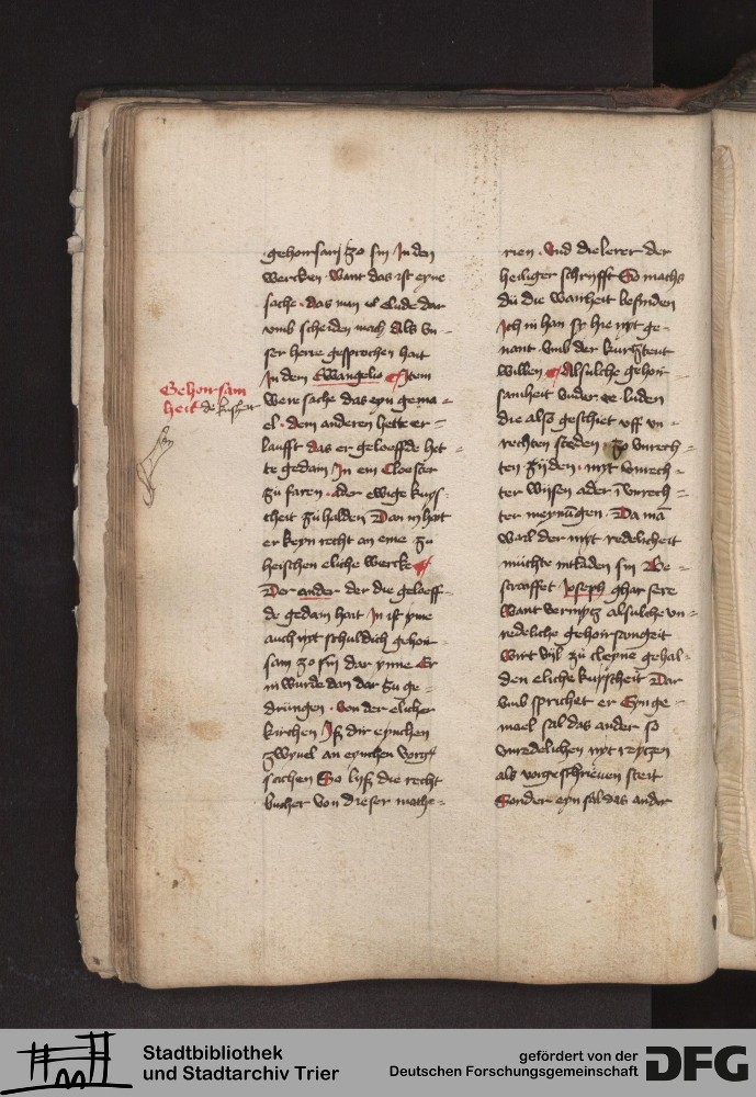 - TextGrid Repository (2017). Stadtbibliothek und Stadtarchiv Trier, 814/1340 4°: Sammelhandschrift. Inhalte. Stadtbibliothek und Stadtarchiv Trier Hs. 814/1340 4°. Dialog über die Kardinaltugenden. Blatt 27v. Blatt 27v. Virtuelles Skriptorium St. Matthias. Stadtbibliothek und Stadtarchiv Trier. https://hdl.handle.net/11378/0000-000A-0239-4