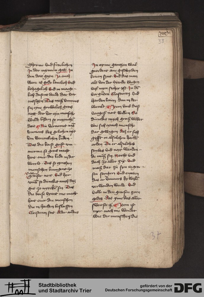 - TextGrid Repository (2017). Stadtbibliothek und Stadtarchiv Trier, 814/1340 4°: Sammelhandschrift. Inhalte. Stadtbibliothek und Stadtarchiv Trier Hs. 814/1340 4°. Dialog über die Kardinaltugenden. Blatt 37r. Blatt 37r. Virtuelles Skriptorium St. Matthias. Stadtbibliothek und Stadtarchiv Trier. https://hdl.handle.net/11378/0000-000A-025F-A
