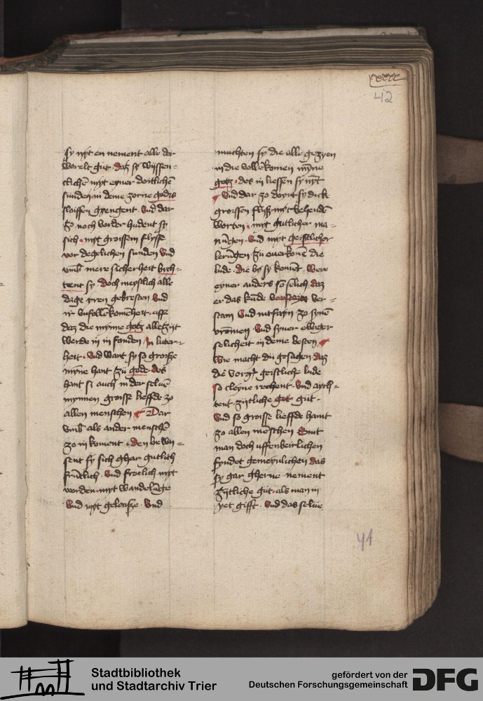 - TextGrid Repository (2017). Stadtbibliothek und Stadtarchiv Trier, 814/1340 4°: Sammelhandschrift. Inhalte. Stadtbibliothek und Stadtarchiv Trier Hs. 814/1340 4°. Dialog über die Kardinaltugenden. Blatt 41r. Blatt 41r. Virtuelles Skriptorium St. Matthias. Stadtbibliothek und Stadtarchiv Trier. https://hdl.handle.net/11378/0000-000A-026F-8