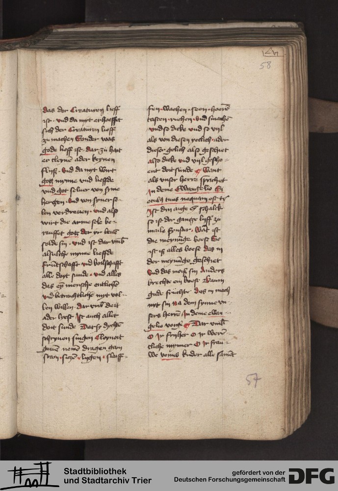 TextGrid Repository (2017). Stadtbibliothek und Stadtarchiv Trier, 814/1340 4°: Sammelhandschrift. Inhalte. Stadtbibliothek und Stadtarchiv Trier Hs. 814/1340 4°. Dialog über die Kardinaltugenden. Blatt 57r. Blatt 57r. Virtuelles Skriptorium St. Matthias. Stadtbibliothek und Stadtarchiv Trier. https://hdl.handle.net/11378/0000-000A-02AF-F