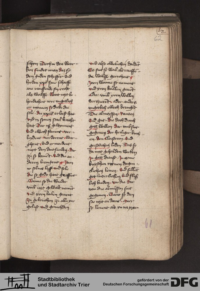 TextGrid Repository (2017). Stadtbibliothek und Stadtarchiv Trier, 814/1340 4°: Sammelhandschrift. Inhalte. Stadtbibliothek und Stadtarchiv Trier Hs. 814/1340 4°. Dialog über die Kardinaltugenden. Blatt 61r. Blatt 61r. Virtuelles Skriptorium St. Matthias. Stadtbibliothek und Stadtarchiv Trier. https://hdl.handle.net/11378/0000-000A-02BF-D