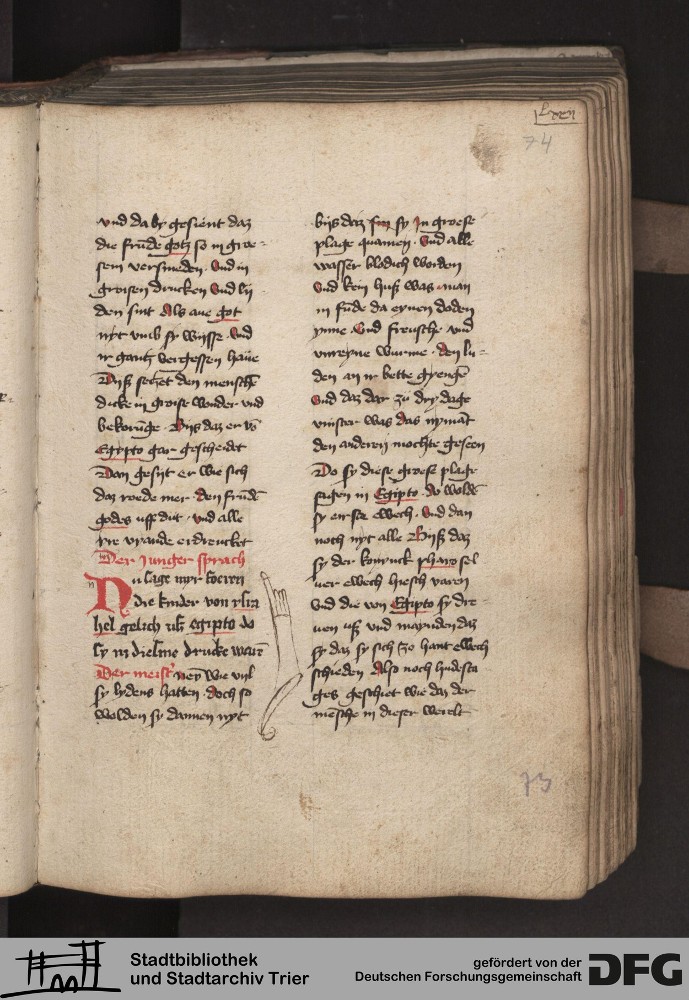 - TextGrid Repository (2017). Stadtbibliothek und Stadtarchiv Trier, 814/1340 4°: Sammelhandschrift. Inhalte. Stadtbibliothek und Stadtarchiv Trier Hs. 814/1340 4°. Dialog über die Kardinaltugenden. Blatt 73r. Blatt 73r. Virtuelles Skriptorium St. Matthias. Stadtbibliothek und Stadtarchiv Trier. https://hdl.handle.net/11378/0000-000A-02EF-7