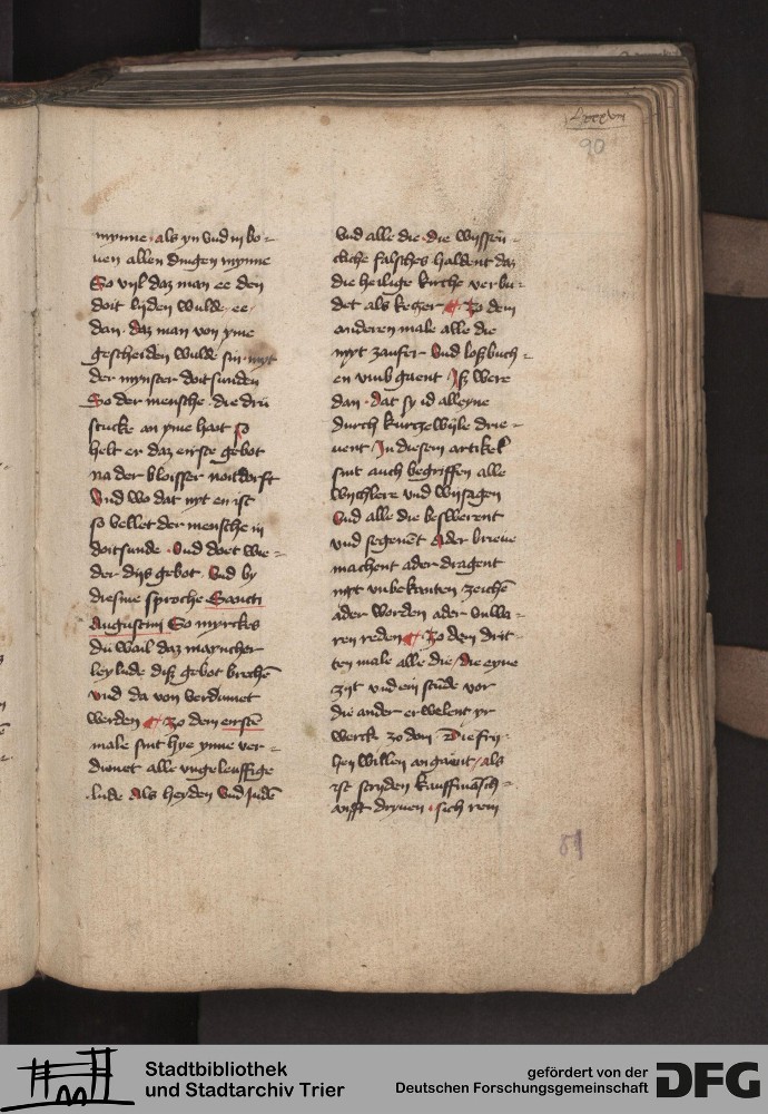TextGrid Repository (2017). Stadtbibliothek und Stadtarchiv Trier, 814/1340 4°: Sammelhandschrift. Inhalte. Stadtbibliothek und Stadtarchiv Trier Hs. 814/1340 4°. Dialog über die 10 Gebote. Blatt 89r. Blatt 89r. Virtuelles Skriptorium St. Matthias. Stadtbibliothek und Stadtarchiv Trier. https://hdl.handle.net/11378/0000-000A-032F-F
