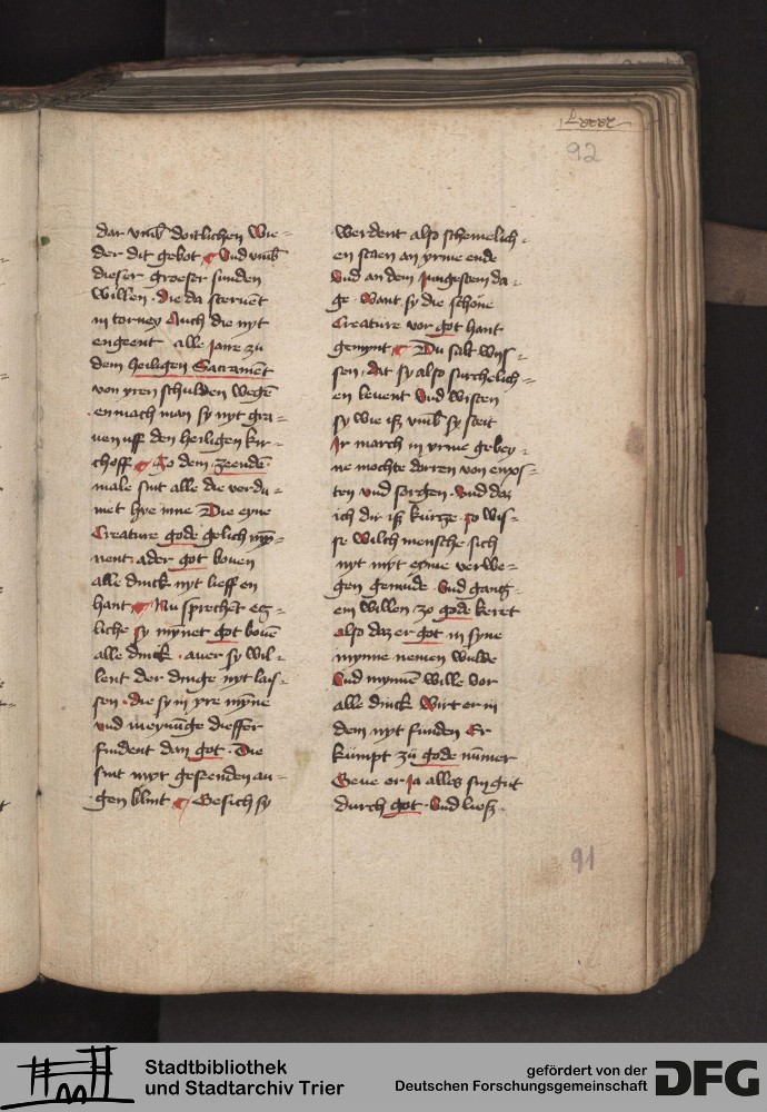 - TextGrid Repository (2017). Stadtbibliothek und Stadtarchiv Trier, 814/1340 4°: Sammelhandschrift. Inhalte. Stadtbibliothek und Stadtarchiv Trier Hs. 814/1340 4°. Dialog über die 10 Gebote. Blatt 91r. Blatt 91r. Virtuelles Skriptorium St. Matthias. Stadtbibliothek und Stadtarchiv Trier. https://hdl.handle.net/11378/0000-000A-0337-5