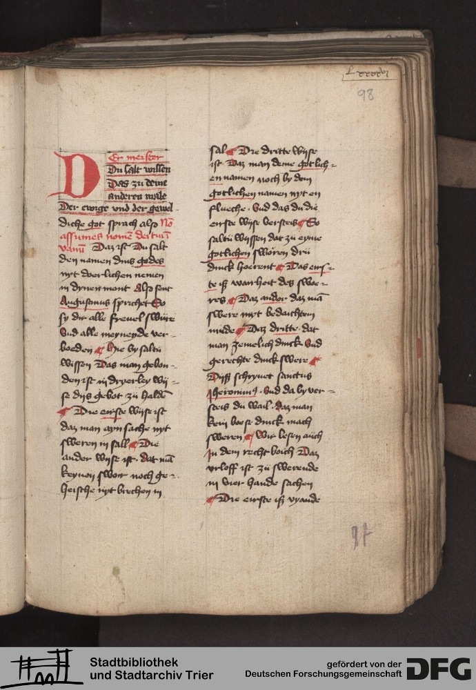 - TextGrid Repository (2017). Stadtbibliothek und Stadtarchiv Trier, 814/1340 4°: Sammelhandschrift. Inhalte. Stadtbibliothek und Stadtarchiv Trier Hs. 814/1340 4°. Dialog über die 10 Gebote. Blatt 97r. Blatt 97r. Virtuelles Skriptorium St. Matthias. Stadtbibliothek und Stadtarchiv Trier. https://hdl.handle.net/11378/0000-000A-034F-B