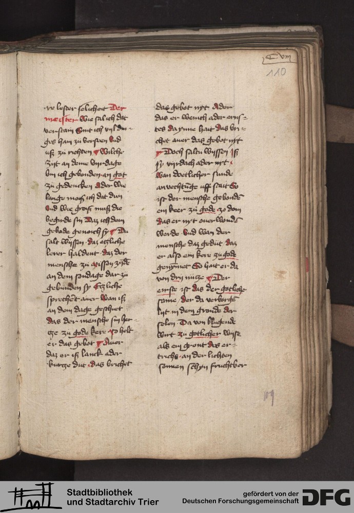 - TextGrid Repository (2017). Stadtbibliothek und Stadtarchiv Trier, 814/1340 4°: Sammelhandschrift. Inhalte. Stadtbibliothek und Stadtarchiv Trier Hs. 814/1340 4°. Dialog über die 10 Gebote. Blatt 109r. Blatt 109r. Virtuelles Skriptorium St. Matthias. Stadtbibliothek und Stadtarchiv Trier. https://hdl.handle.net/11378/0000-000A-037F-5