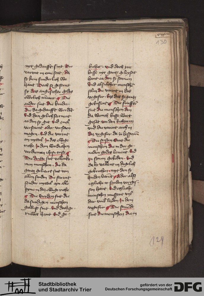 - TextGrid Repository (2017). Stadtbibliothek und Stadtarchiv Trier, 814/1340 4°: Sammelhandschrift. Inhalte. Stadtbibliothek und Stadtarchiv Trier Hs. 814/1340 4°. Dialog über die 10 Gebote. Blatt 129r. Blatt 129r. Virtuelles Skriptorium St. Matthias. Stadtbibliothek und Stadtarchiv Trier. https://hdl.handle.net/11378/0000-000A-03CF-A