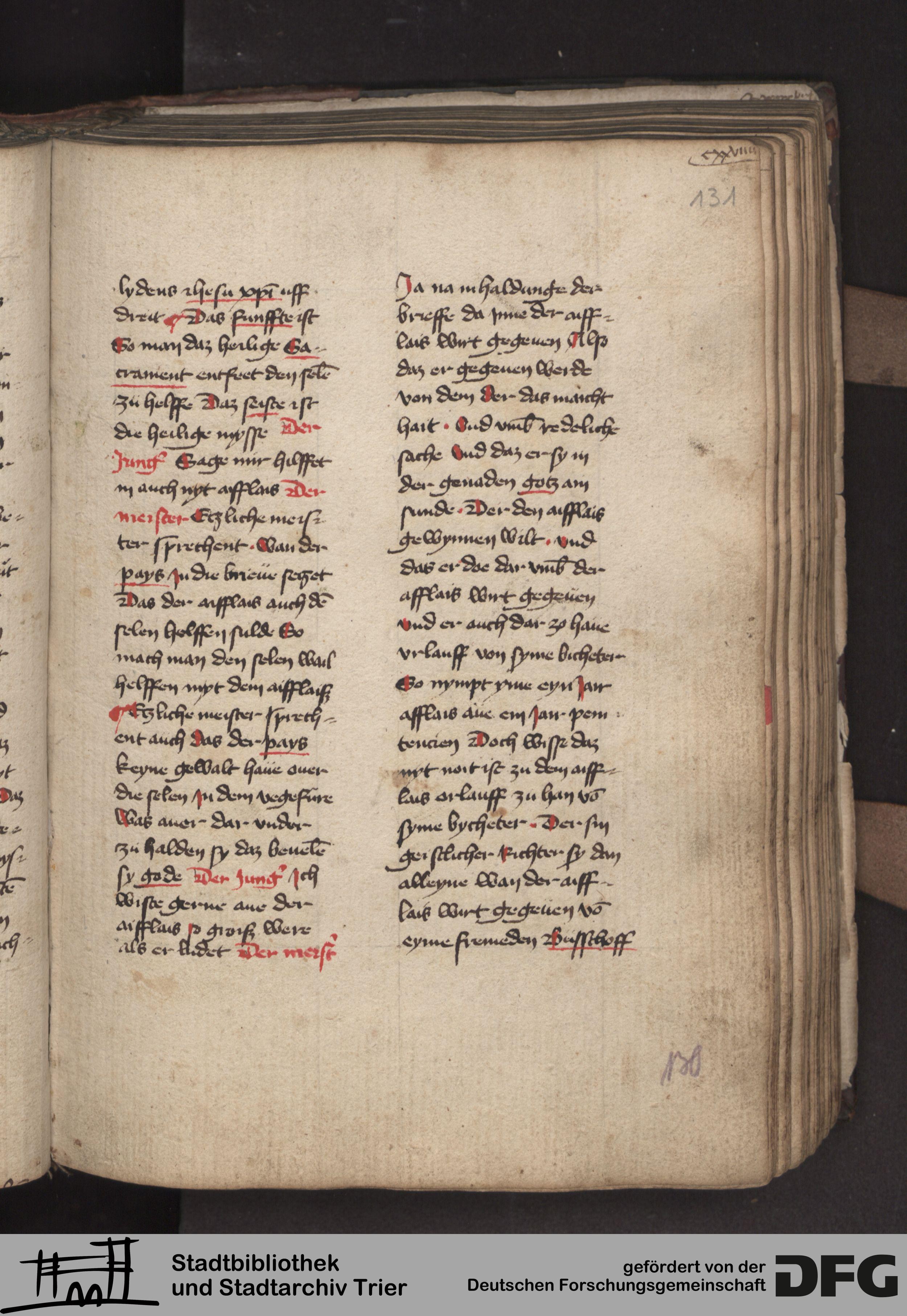 - TextGrid Repository (2017). Stadtbibliothek und Stadtarchiv Trier, 814/1340 4°: Sammelhandschrift. Inhalte. Stadtbibliothek und Stadtarchiv Trier Hs. 814/1340 4°. Dialog über die 10 Gebote. Blatt 130r. Blatt 130r. Virtuelles Skriptorium St. Matthias. Stadtbibliothek und Stadtarchiv Trier. https://hdl.handle.net/11378/0000-000A-03D3-4