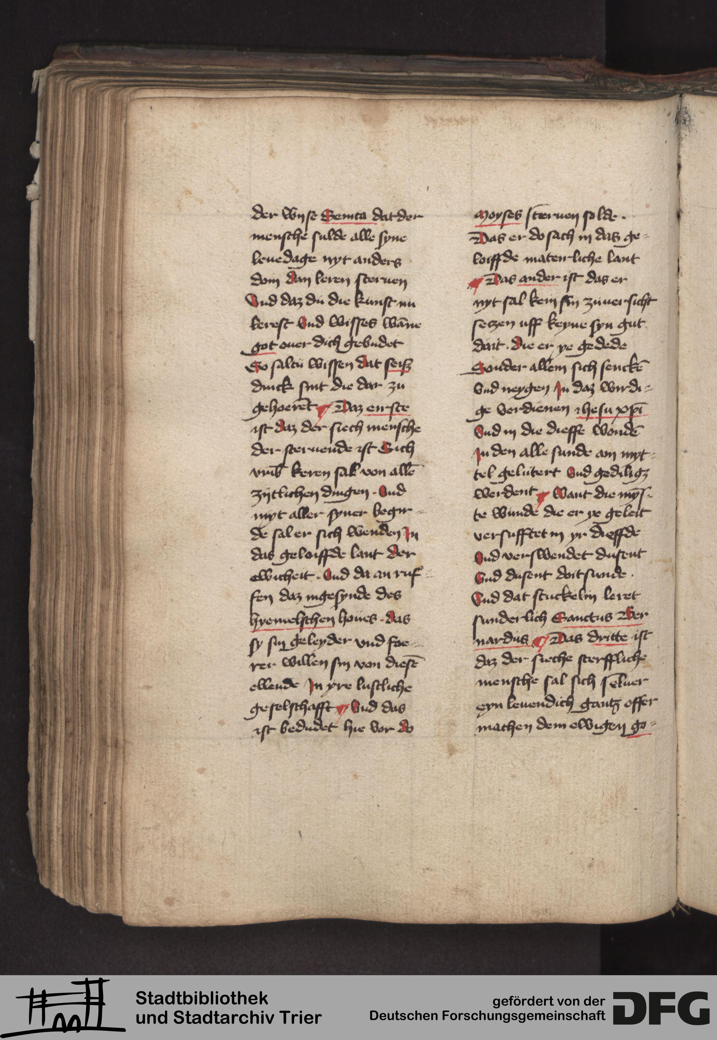 - TextGrid Repository (2017). Stadtbibliothek und Stadtarchiv Trier, 814/1340 4°: Sammelhandschrift. Inhalte. Stadtbibliothek und Stadtarchiv Trier Hs. 814/1340 4°. Dialog über die 10 Gebote. Blatt 131v. Blatt 131v. Virtuelles Skriptorium St. Matthias. Stadtbibliothek und Stadtarchiv Trier. https://hdl.handle.net/11378/0000-000A-03D9-E