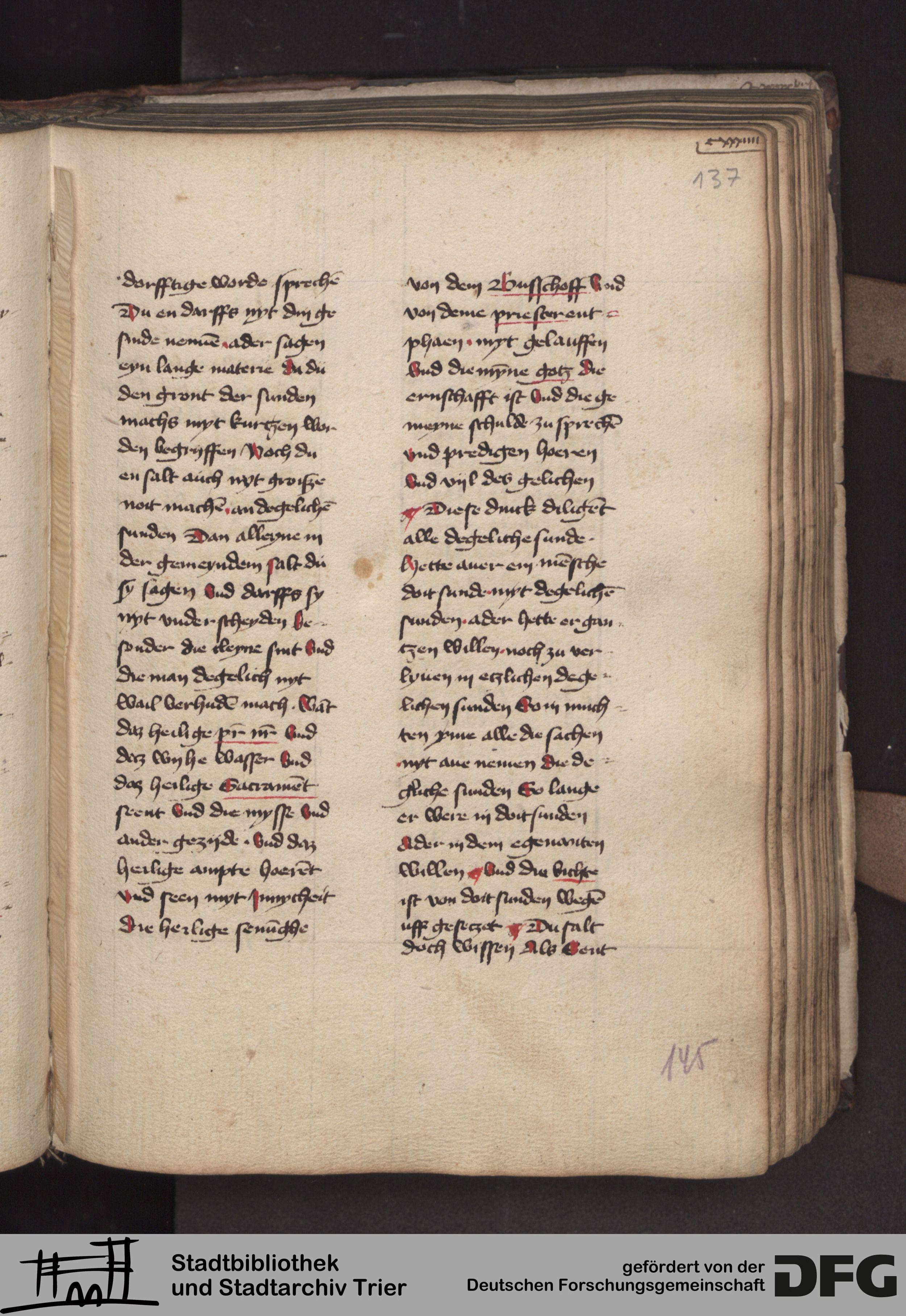 - TextGrid Repository (2017). Stadtbibliothek und Stadtarchiv Trier, 814/1340 4°: Sammelhandschrift. Inhalte. Stadtbibliothek und Stadtarchiv Trier Hs. 814/1340 4°. Dialog über die 10 Gebote. Blatt 136r. Blatt 136r. Virtuelles Skriptorium St. Matthias. Stadtbibliothek und Stadtarchiv Trier. https://hdl.handle.net/11378/0000-000A-03EB-A