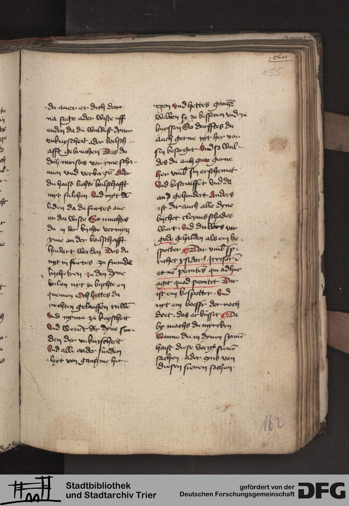 - TextGrid Repository (2017). Stadtbibliothek und Stadtarchiv Trier, 814/1340 4°: Sammelhandschrift. Inhalte. Stadtbibliothek und Stadtarchiv Trier Hs. 814/1340 4°. Dialog über die 10 Gebote. Blatt 154r. Blatt 154r. Virtuelles Skriptorium St. Matthias. Stadtbibliothek und Stadtarchiv Trier. https://hdl.handle.net/11378/0000-000A-0433-8