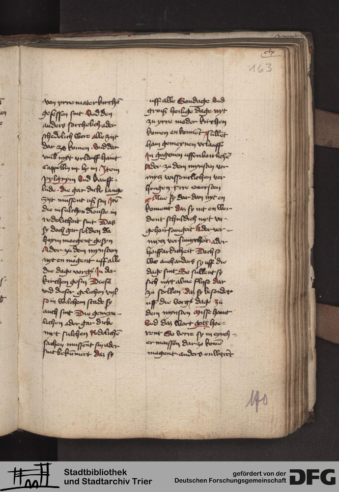 - TextGrid Repository (2017). Stadtbibliothek und Stadtarchiv Trier, 814/1340 4°: Sammelhandschrift. Inhalte. Stadtbibliothek und Stadtarchiv Trier Hs. 814/1340 4°. Dialog über die 10 Gebote. Blatt 162r. Blatt 162r. Virtuelles Skriptorium St. Matthias. Stadtbibliothek und Stadtarchiv Trier. https://hdl.handle.net/11378/0000-000A-0453-4