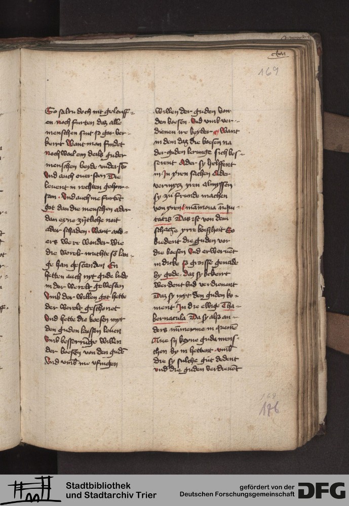 - TextGrid Repository (2017). Stadtbibliothek und Stadtarchiv Trier, 814/1340 4°: Sammelhandschrift. Inhalte. Stadtbibliothek und Stadtarchiv Trier Hs. 814/1340 4°. Dialog über die 10 Gebote. Blatt 168r. Blatt 168r. Virtuelles Skriptorium St. Matthias. Stadtbibliothek und Stadtarchiv Trier. https://hdl.handle.net/11378/0000-000A-046B-A
