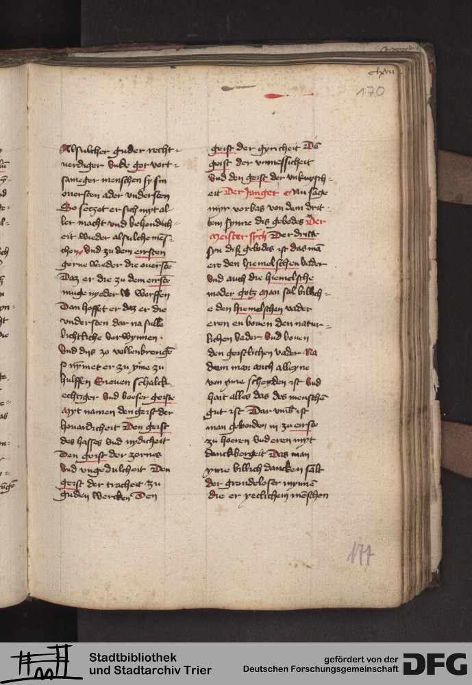 - TextGrid Repository (2017). Stadtbibliothek und Stadtarchiv Trier, 814/1340 4°: Sammelhandschrift. Inhalte. Stadtbibliothek und Stadtarchiv Trier Hs. 814/1340 4°. Dialog über die 10 Gebote. Blatt 169r. Blatt 169r. Virtuelles Skriptorium St. Matthias. Stadtbibliothek und Stadtarchiv Trier. https://hdl.handle.net/11378/0000-000A-046F-6
