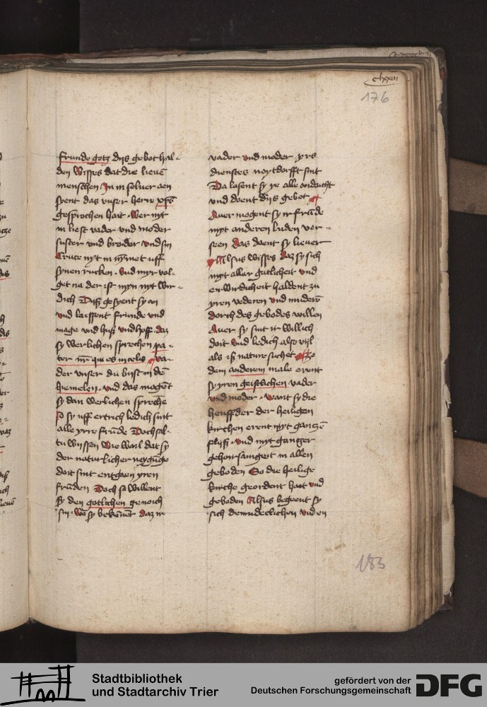 - TextGrid Repository (2017). Stadtbibliothek und Stadtarchiv Trier, 814/1340 4°: Sammelhandschrift. Inhalte. Stadtbibliothek und Stadtarchiv Trier Hs. 814/1340 4°. Dialog über die 10 Gebote. Blatt 175r. Blatt 175r. Virtuelles Skriptorium St. Matthias. Stadtbibliothek und Stadtarchiv Trier. https://hdl.handle.net/11378/0000-000A-0487-9
