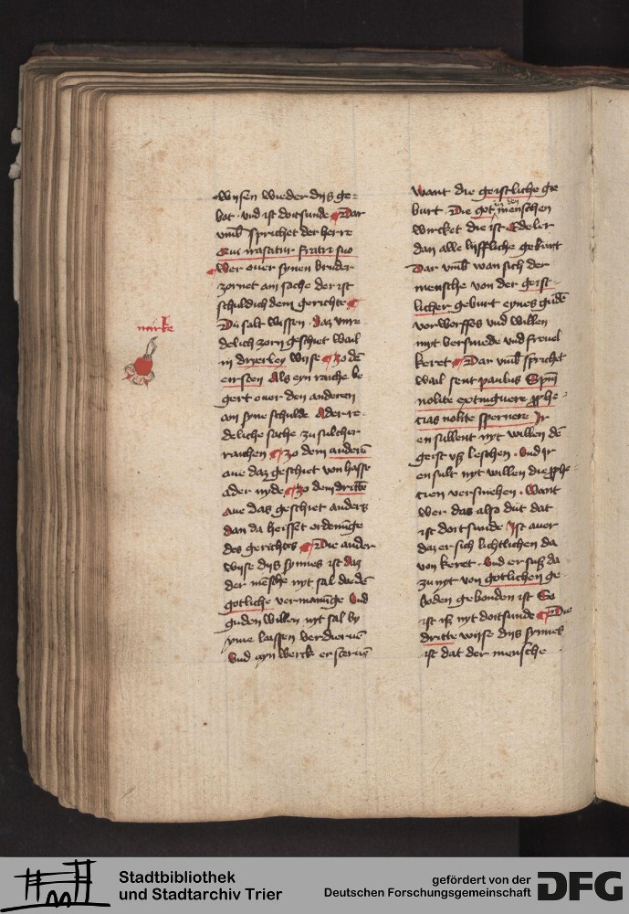 - TextGrid Repository (2017). Stadtbibliothek und Stadtarchiv Trier, 814/1340 4°: Sammelhandschrift. Inhalte. Stadtbibliothek und Stadtarchiv Trier Hs. 814/1340 4°. Dialog über die 10 Gebote. Blatt 181v. Blatt 181v. Virtuelles Skriptorium St. Matthias. Stadtbibliothek und Stadtarchiv Trier. https://hdl.handle.net/11378/0000-000A-04A1-B