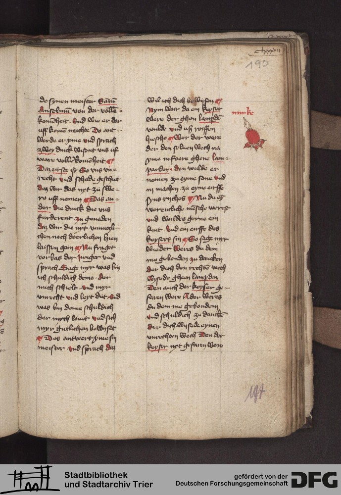 - TextGrid Repository (2017). Stadtbibliothek und Stadtarchiv Trier, 814/1340 4°: Sammelhandschrift. Inhalte. Stadtbibliothek und Stadtarchiv Trier Hs. 814/1340 4°. Dialog über die 10 Gebote. Blatt 189r. Blatt 189r. Virtuelles Skriptorium St. Matthias. Stadtbibliothek und Stadtarchiv Trier. https://hdl.handle.net/11378/0000-000A-04BF-B