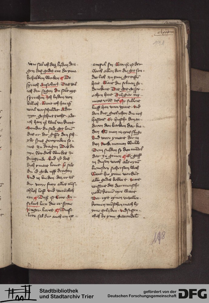 - TextGrid Repository (2017). Stadtbibliothek und Stadtarchiv Trier, 814/1340 4°: Sammelhandschrift. Inhalte. Stadtbibliothek und Stadtarchiv Trier Hs. 814/1340 4°. Dialog über die 10 Gebote. Blatt 190r. Blatt 190r. Virtuelles Skriptorium St. Matthias. Stadtbibliothek und Stadtarchiv Trier. https://hdl.handle.net/11378/0000-000A-04C3-5