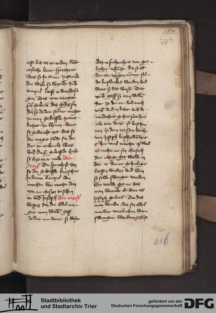 - TextGrid Repository (2017). Stadtbibliothek und Stadtarchiv Trier, 814/1340 4°: Sammelhandschrift. Inhalte. Stadtbibliothek und Stadtarchiv Trier Hs. 814/1340 4°. Dialog über die 10 Gebote. Blatt 208r. Blatt 208r. Virtuelles Skriptorium St. Matthias. Stadtbibliothek und Stadtarchiv Trier. https://hdl.handle.net/11378/0000-000A-050B-5
