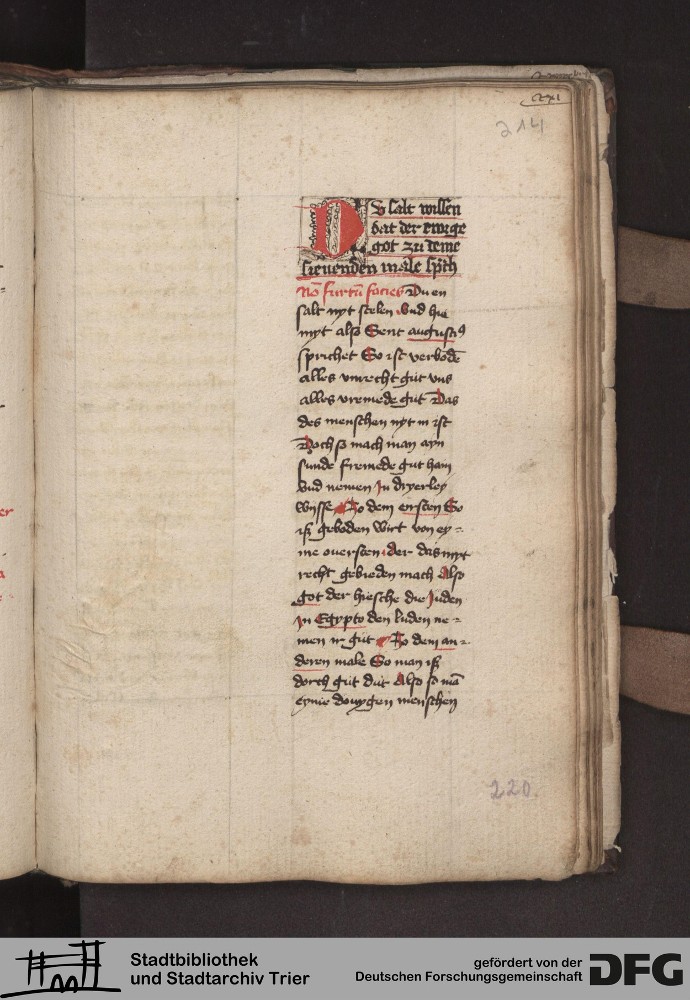 - TextGrid Repository (2017). Stadtbibliothek und Stadtarchiv Trier, 814/1340 4°: Sammelhandschrift. Inhalte. Stadtbibliothek und Stadtarchiv Trier Hs. 814/1340 4°. Dialog über die 10 Gebote. Blatt 213r. Blatt 213r. Virtuelles Skriptorium St. Matthias. Stadtbibliothek und Stadtarchiv Trier. https://hdl.handle.net/11378/0000-000A-051F-F