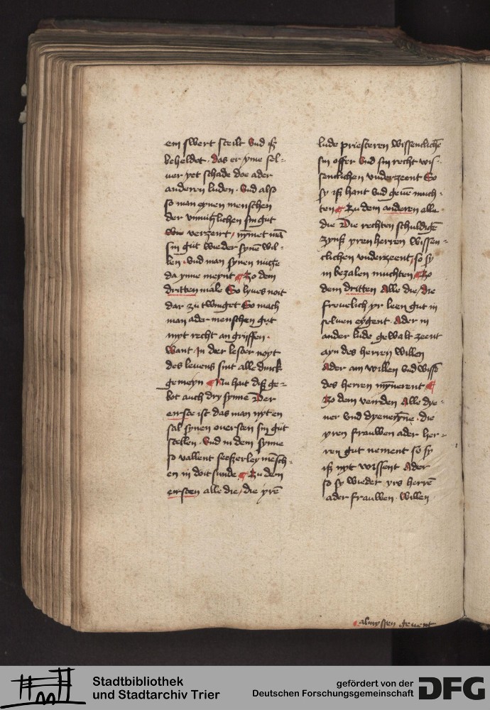 TextGrid Repository (2017). Stadtbibliothek und Stadtarchiv Trier, 814/1340 4°: Sammelhandschrift. Inhalte. Stadtbibliothek und Stadtarchiv Trier Hs. 814/1340 4°. Dialog über die 10 Gebote. Blatt 213v. Blatt 213v. Virtuelles Skriptorium St. Matthias. Stadtbibliothek und Stadtarchiv Trier. https://hdl.handle.net/11378/0000-000A-0521-B