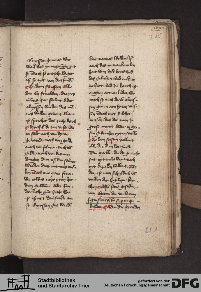 - TextGrid Repository (2017). Stadtbibliothek und Stadtarchiv Trier, 814/1340 4°: Sammelhandschrift. Inhalte. Stadtbibliothek und Stadtarchiv Trier Hs. 814/1340 4°. Dialog über die 10 Gebote. Blatt 214r. Blatt 214r. Virtuelles Skriptorium St. Matthias. Stadtbibliothek und Stadtarchiv Trier. https://hdl.handle.net/11378/0000-000A-0523-9