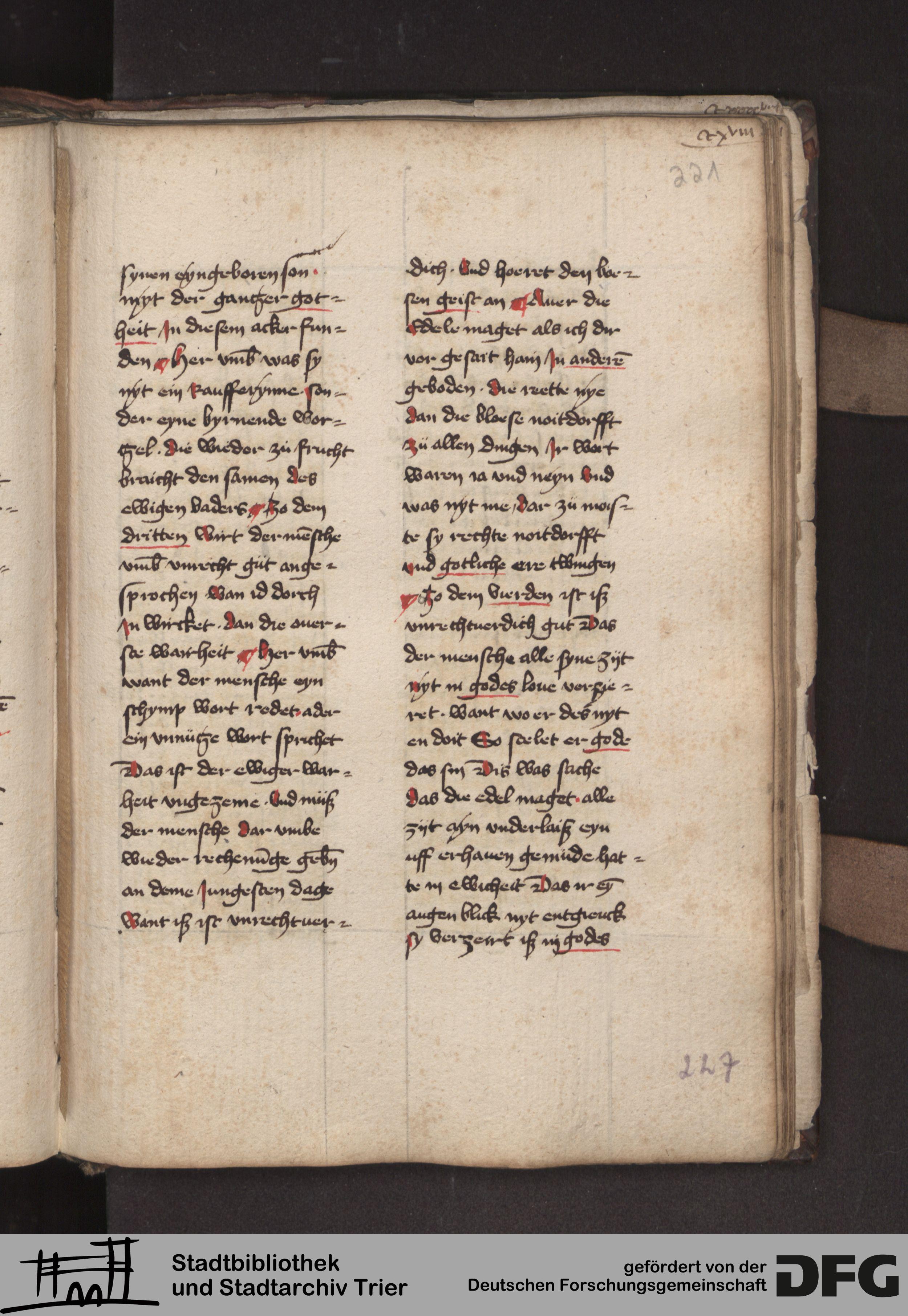 - TextGrid Repository (2017). Stadtbibliothek und Stadtarchiv Trier, 814/1340 4°: Sammelhandschrift. Inhalte. Stadtbibliothek und Stadtarchiv Trier Hs. 814/1340 4°. Dialog über die 10 Gebote. Blatt 220r. Blatt 220r. Virtuelles Skriptorium St. Matthias. Stadtbibliothek und Stadtarchiv Trier. https://hdl.handle.net/11378/0000-000A-053B-F