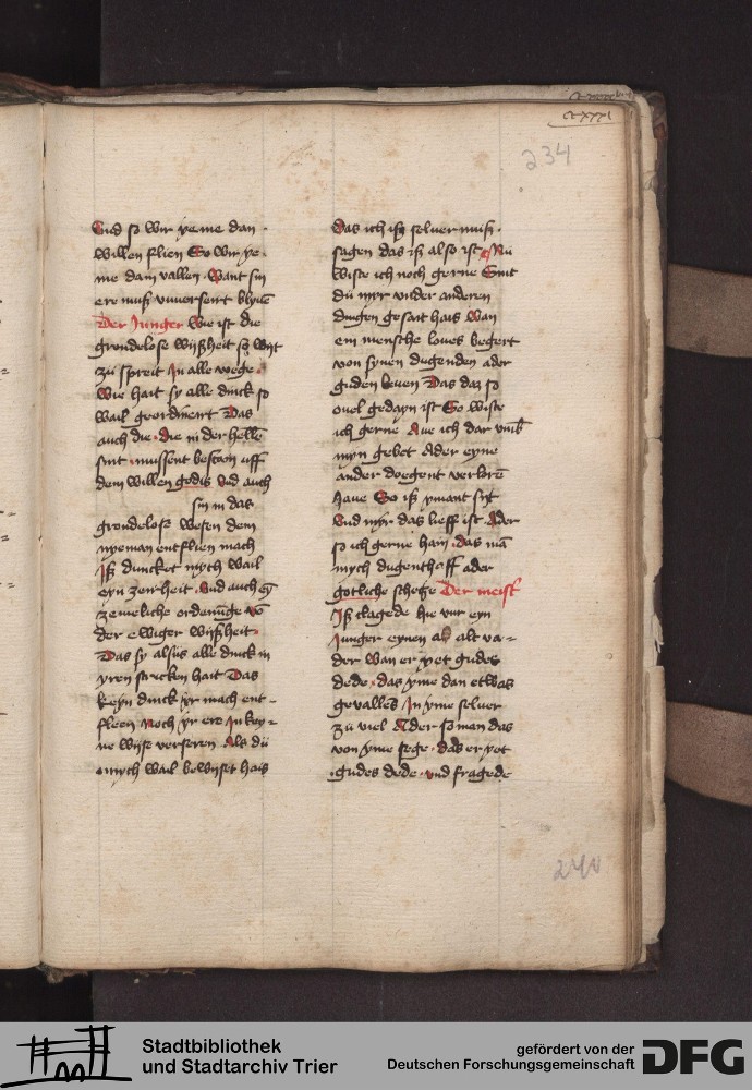 - TextGrid Repository (2017). Stadtbibliothek und Stadtarchiv Trier, 814/1340 4°: Sammelhandschrift. Inhalte. Stadtbibliothek und Stadtarchiv Trier Hs. 814/1340 4°. Dialog über die 10 Gebote. Blatt 233r. Blatt 233r. Virtuelles Skriptorium St. Matthias. Stadtbibliothek und Stadtarchiv Trier. https://hdl.handle.net/11378/0000-000A-056F-5