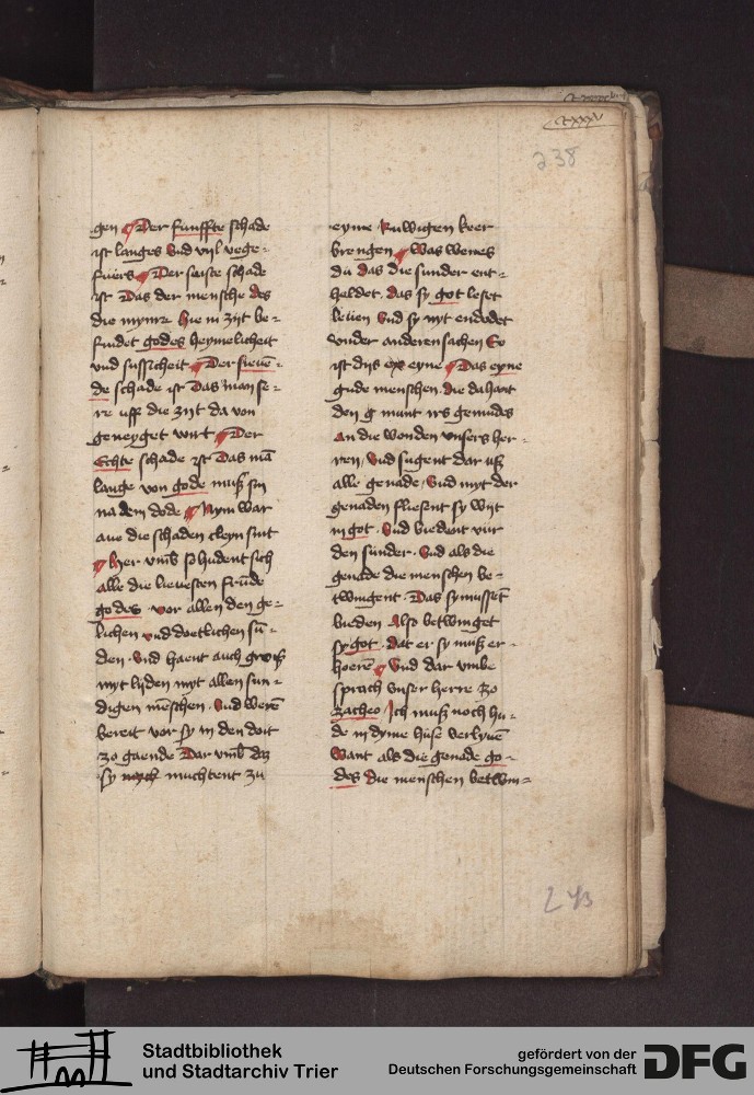 TextGrid Repository (2017). Stadtbibliothek und Stadtarchiv Trier, 814/1340 4°: Sammelhandschrift. Inhalte. Stadtbibliothek und Stadtarchiv Trier Hs. 814/1340 4°. Dialog über die 10 Gebote. Blatt 237r. Blatt 237r. Virtuelles Skriptorium St. Matthias. Stadtbibliothek und Stadtarchiv Trier. https://hdl.handle.net/11378/0000-000A-057F-3