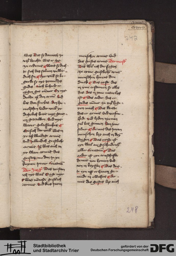 - TextGrid Repository (2017). Stadtbibliothek und Stadtarchiv Trier, 814/1340 4°: Sammelhandschrift. Inhalte. Stadtbibliothek und Stadtarchiv Trier Hs. 814/1340 4°. Dialog über die 10 Gebote. Blatt 241r. Blatt 241r. Virtuelles Skriptorium St. Matthias. Stadtbibliothek und Stadtarchiv Trier. https://hdl.handle.net/11378/0000-000A-058F-0