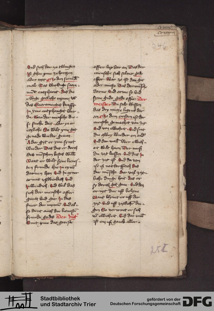 - TextGrid Repository (2017). Stadtbibliothek und Stadtarchiv Trier, 814/1340 4°: Sammelhandschrift. Inhalte. Stadtbibliothek und Stadtarchiv Trier Hs. 814/1340 4°. Dialog über die 10 Gebote. Blatt 245r. Blatt 245r. Virtuelles Skriptorium St. Matthias. Stadtbibliothek und Stadtarchiv Trier. https://hdl.handle.net/11378/0000-000A-059F-E