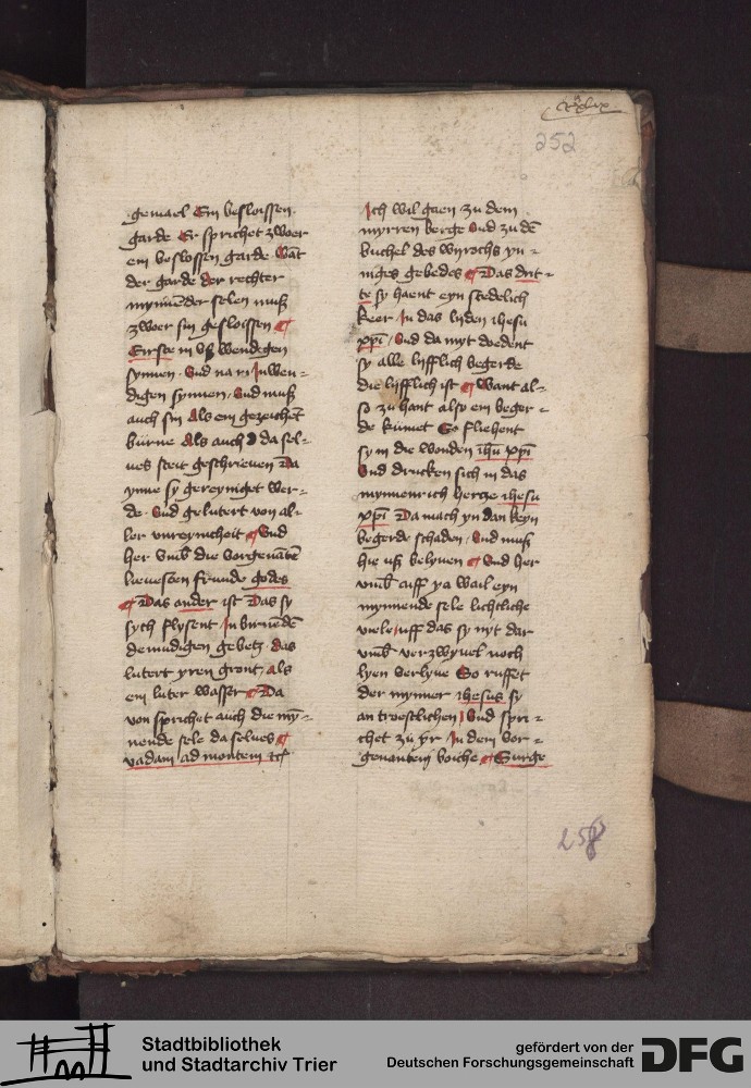 - TextGrid Repository (2017). Stadtbibliothek und Stadtarchiv Trier, 814/1340 4°: Sammelhandschrift. Inhalte. Stadtbibliothek und Stadtarchiv Trier Hs. 814/1340 4°. Dialog über die 10 Gebote. Blatt 251r. Blatt 251r. Virtuelles Skriptorium St. Matthias. Stadtbibliothek und Stadtarchiv Trier. https://hdl.handle.net/11378/0000-000A-05B7-2