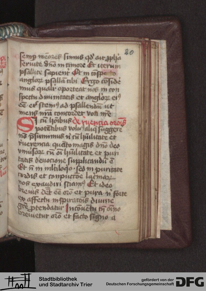 - TextGrid Repository (2017). Stadtbibliothek und Stadtarchiv Trier, Hs. 1249/594 8°: Sammelhandschrift. Inhalte. Stadtbibliothek und Stadtarchiv Trier Hs. 1249/594 8°. Regula s. Benedicti. Blatt 20r. Blatt 20r. Virtuelles Skriptorium St. Matthias. Stadtbibliothek und Stadtarchiv Trier. https://hdl.handle.net/11378/0000-000A-CED7-C